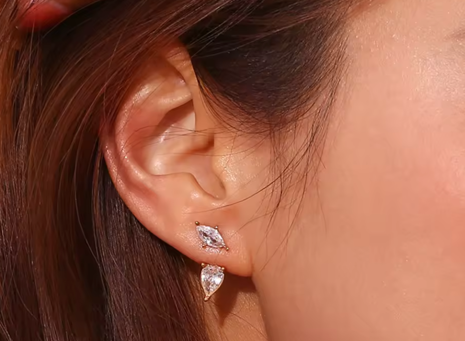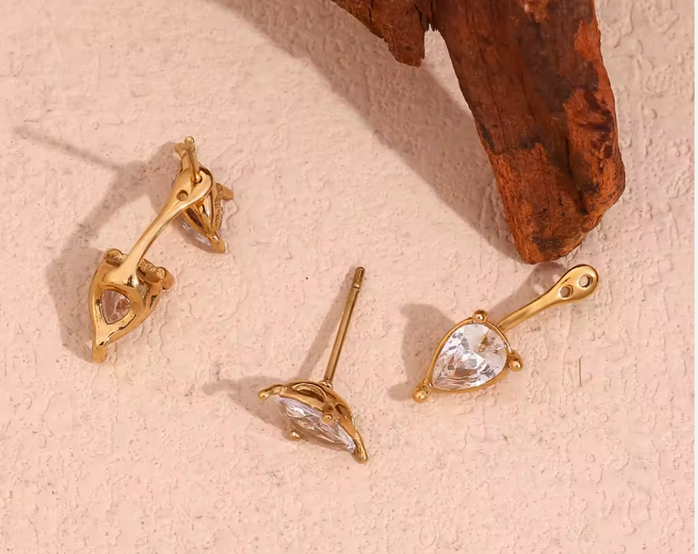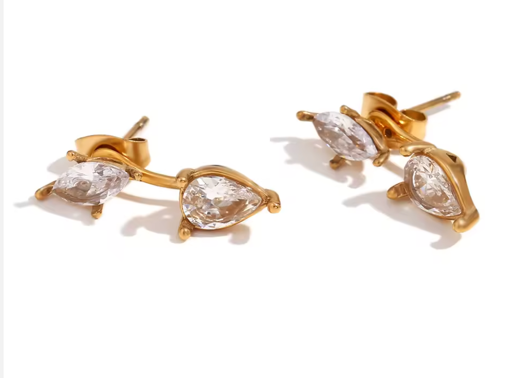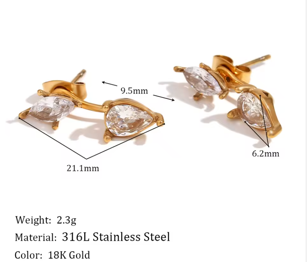 The Elara Earrings feature a unique two-way design that lets you wear them as delicate crystal studs or with their modern drop attachment for added shimmer. Each piece is plated in radiant 18K gold and set with luminous crystals that catch the light with every turn.