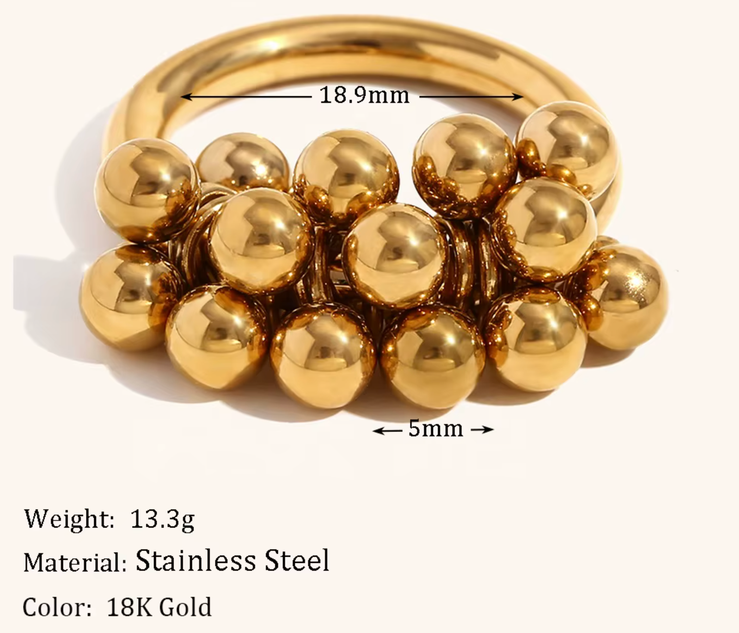 Bold meets soft in this statement-making design. Crafted from premium stainless steel and finished in radiant 18K gold plating, this ring features a cluster of polished spheres that catch the light with every movement. Its smooth, sculptural form brings a touch of modern artistry to your everyday style.