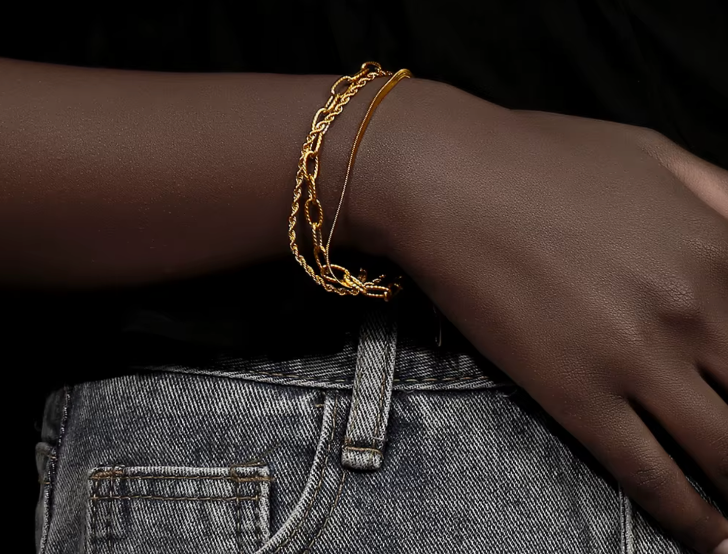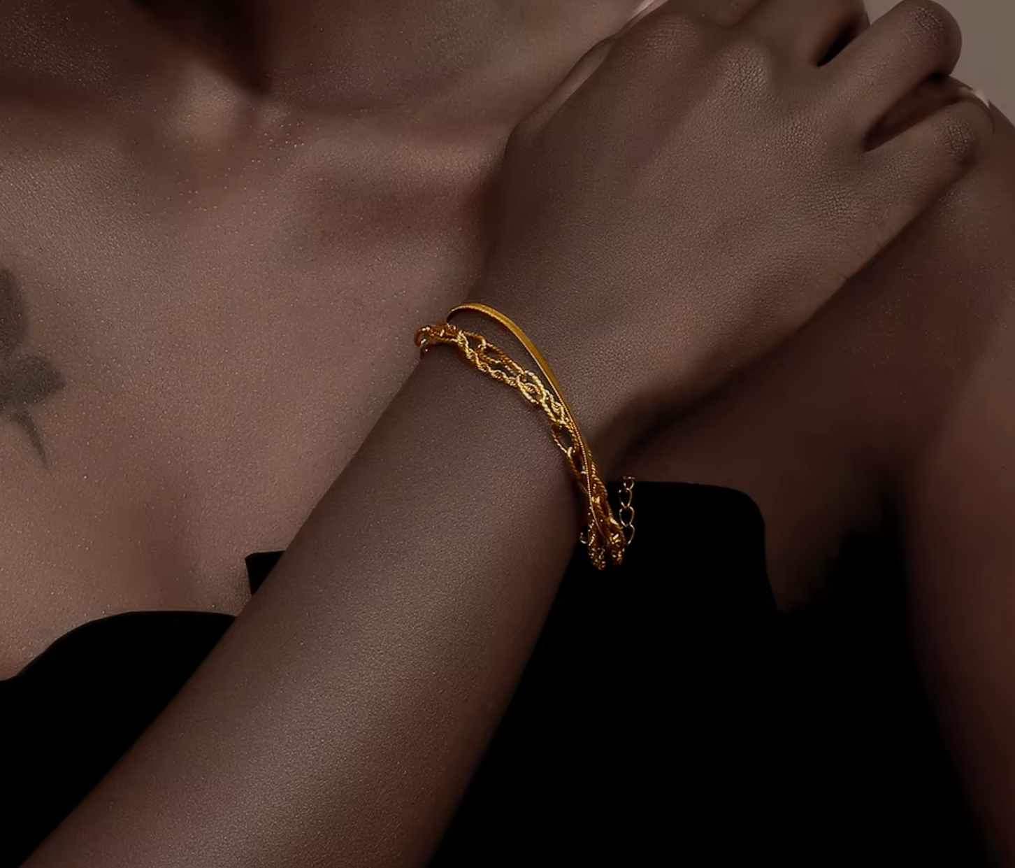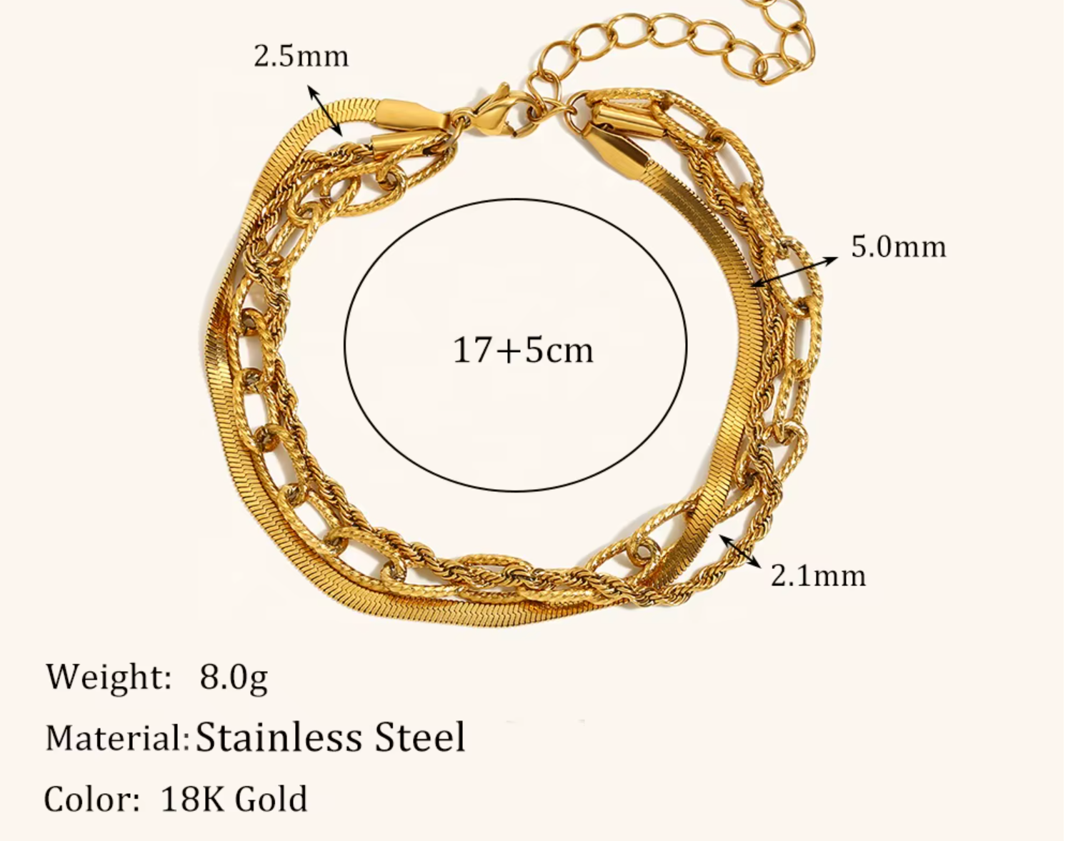 The Shan Bracelet pairs a sleek, minimalist bangle with a softly draped chain for the perfect touch of movement and light. Crafted from premium stainless steel and finished in radiant 18K gold plating, this piece balances refinement and ease — a whisper of luxury for every day.
