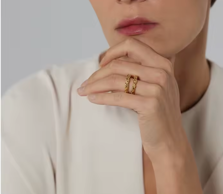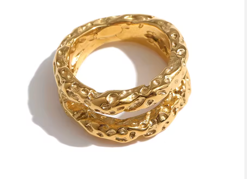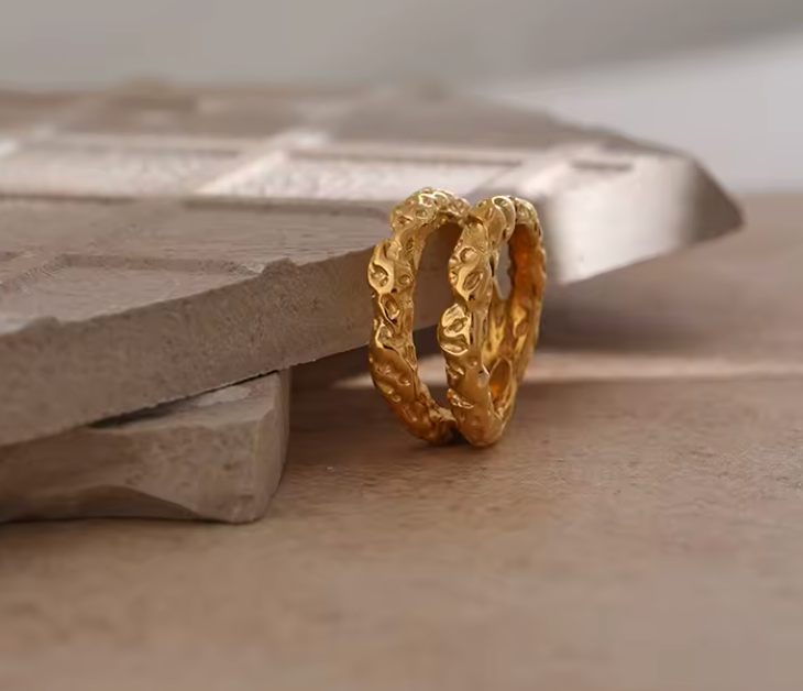 The Terra Ring features a hand-sculpted texture plated in radiant 18K gold, crafted from durable stainless steel for effortless, everyday wear. Its organic silhouette captures the quiet elegance of something shaped by time — bold, feminine, and timeless all at once.